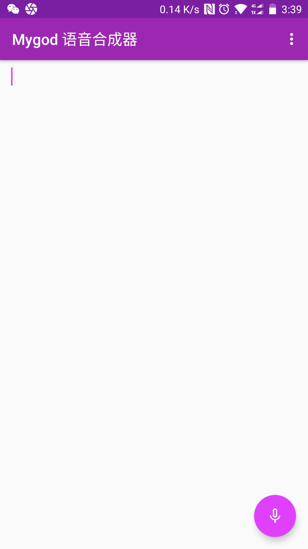 • 设置完成回到主界面,在空白处输入我们需要转语音的内容,点击右下角的话筒标志即可播放合成的语音,如果需要导出到音频文件的话点击右上角的三个小点,选择“合成到文件”保存即可。