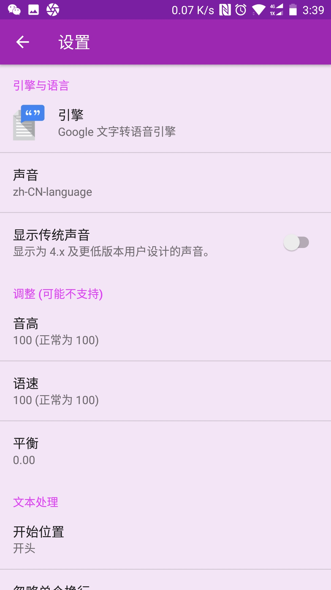 • 点击右上角的三个小点进入设置面板,选择“引擎与语音”下的选项为“Google文字转语音引擎”